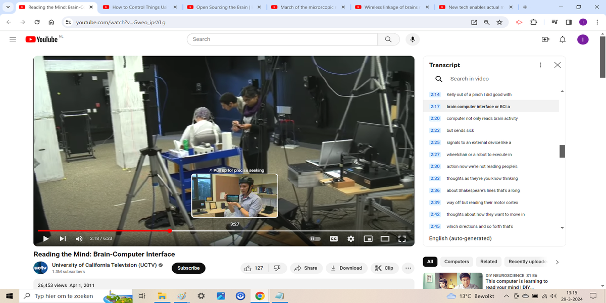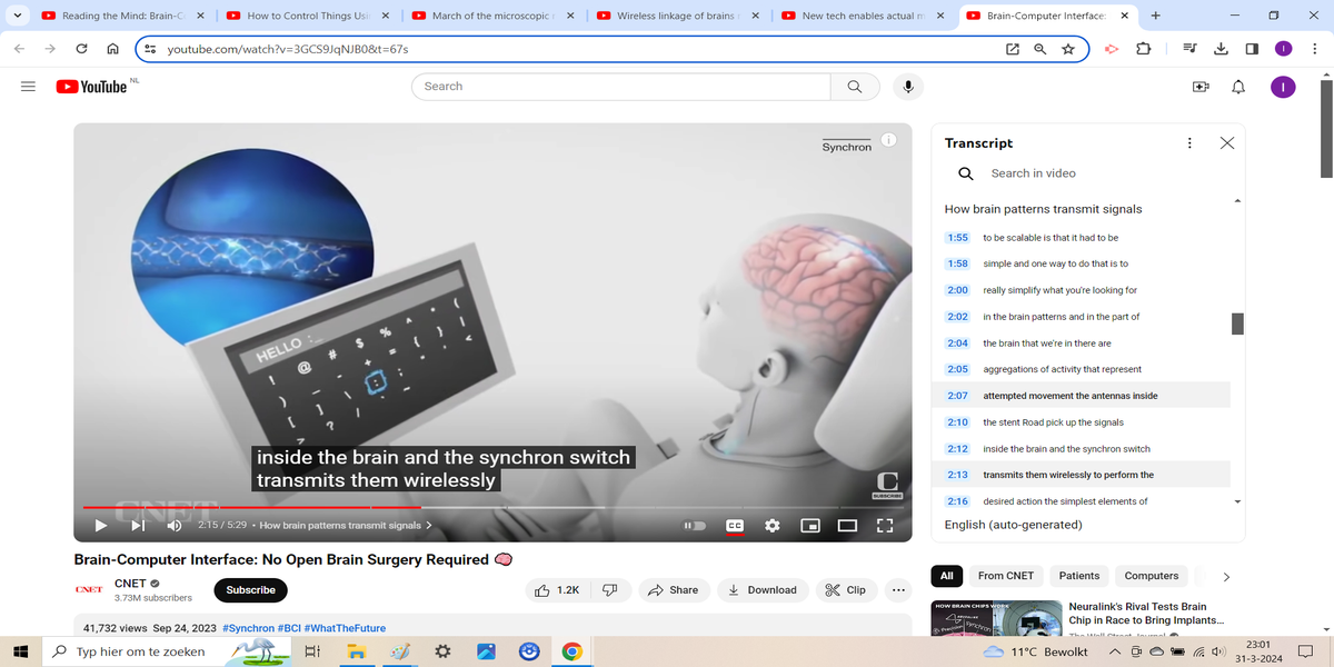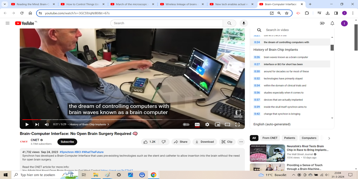 BCIs come in two forms, invasive, so in the head itself, and non-invasive, using an external wearable cap, glasses or other device on the head. Invasive used to mean via an implant, but now that there are nanobots as small as a grain of salt, that is no longer necessary. They are called neurograins and can both read information and write it to the brain, and this happens live and in real time, at the same time that something is happening. This allows you to influence all processes in a body. A non-invasive BCI now simply exists in the form of glasses with an EEG sensor that picks up the signals from your brain, allowing you to communicate with a computer by simply thinking about something. The technology is so advanced that not only is it possible to control an external robotarm with your thoughts but also to feel things with prosthetic limbs.