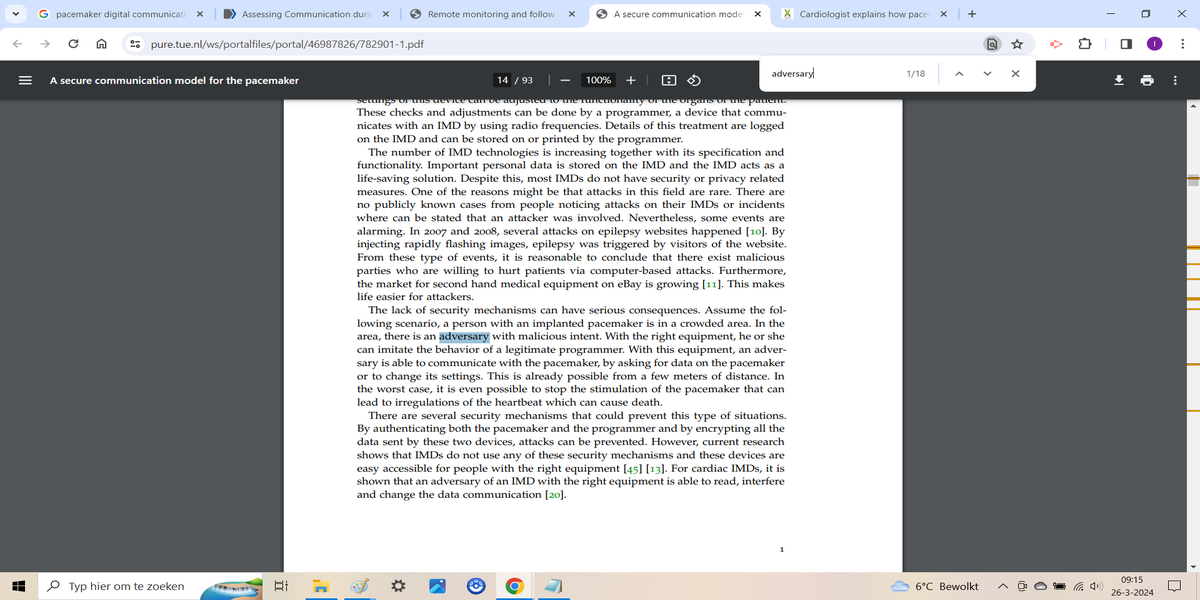 The internet of bodies is the network of devices inside people's bodies that are connected with the internet and thus possibly with eachother. These devices can be monitored and altered remotely by doctors, making them susceptible to possible hacking by others. Hypothetically it is possible for someone to gain access to a device inside you, holding your body ransom or worse. This pdf describes a MITM attack (a form of a computer breach) and how pacemakers should be secured.